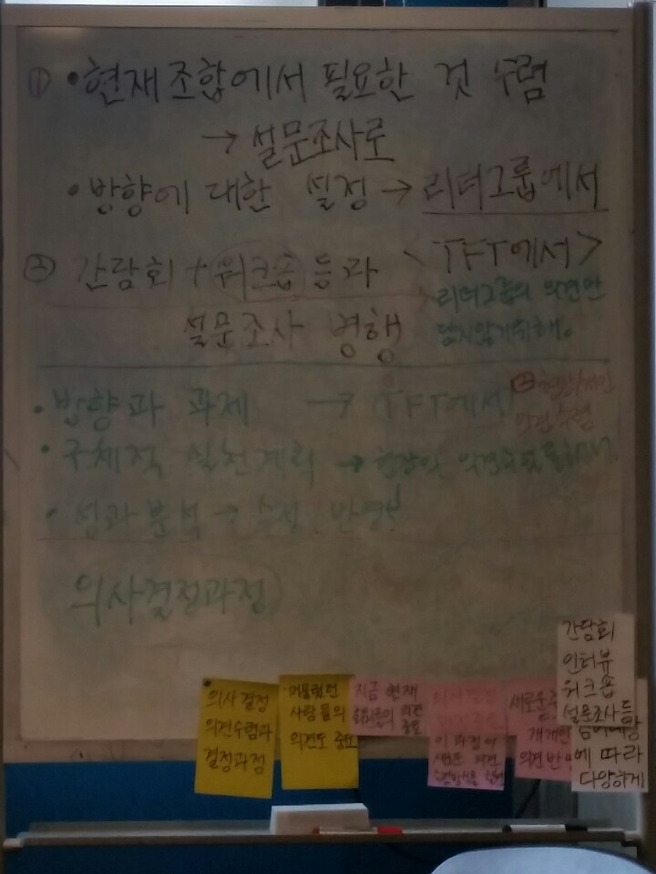 그 자리에서 모두가 합의했던 원칙은 회원들의 의견을 모으는 자리를 통해서 의견을 널리 모으고, 회원들이 자신의 일로 받아들일 수 있는 중장기계획을 수립하는 것입니다.