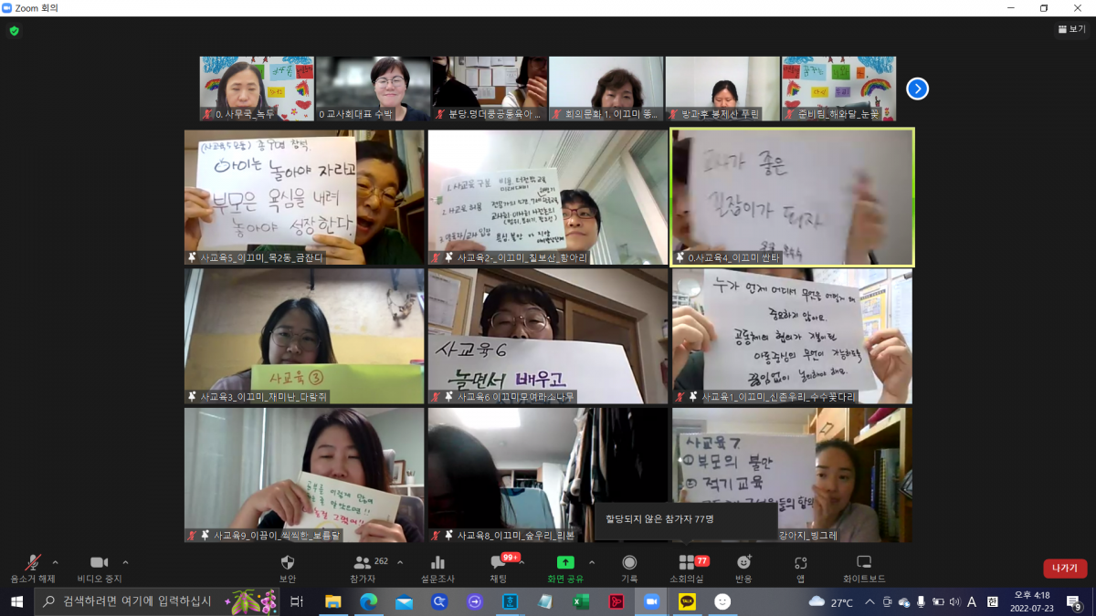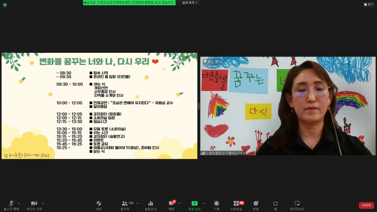 2022년 여름 교사대회가 7월 21일(목)부터 23일(토)까지 변화를 주제로 하며 연대와 성장 그리고 쉼을 목표로 하여 온라인으로 진행되었습니다.