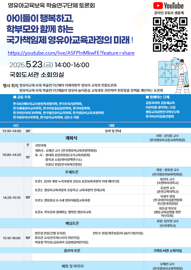 2025년 5월 16일 2시부터 국회도서관에서 진행된 '아이가 행복하고 학부모가 함께하는 국가책임제 영유아교육과정의 미래'입니다.