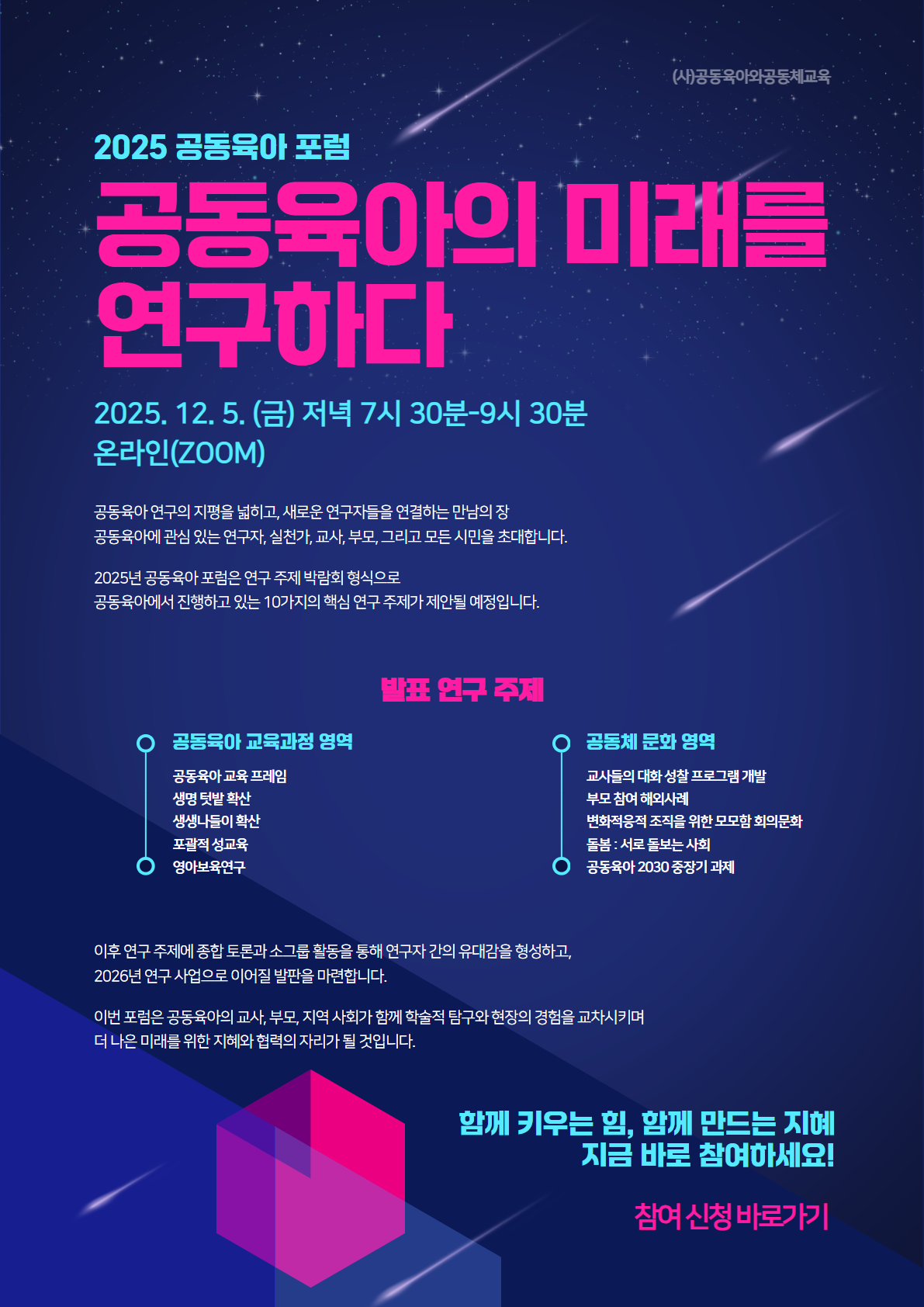 다양한 연구들이 계획대로 진행되어 공동육아 연구 내용이 풍부해지기를 바래봅니다.