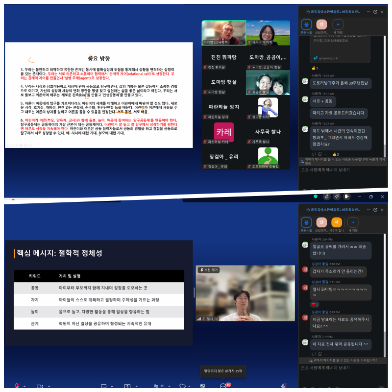 그사이(이기범) 이사장은 <놀이와 공동 탐구로 성장하는 아이들>이라는 제목으로 강의를 해 주셨습니다. 공동육아에서 말하는 교육을 “서로 돌봄과 서로 배움으로 서로 성장하는 것”으로 정의내렸습니다. 2030 공동육아 중장기 계획을 통해 정리한 “0~12세 아동의 초기 사회화”가 중요한 이유는 평생 성장의 발판이 되기 때문이라고 강조하셨습니다. 공동육아와 공동체교육을 통해 아이가 자발적으로 배움의 길에 들어서는 것이 중요하다 하셨습니다.