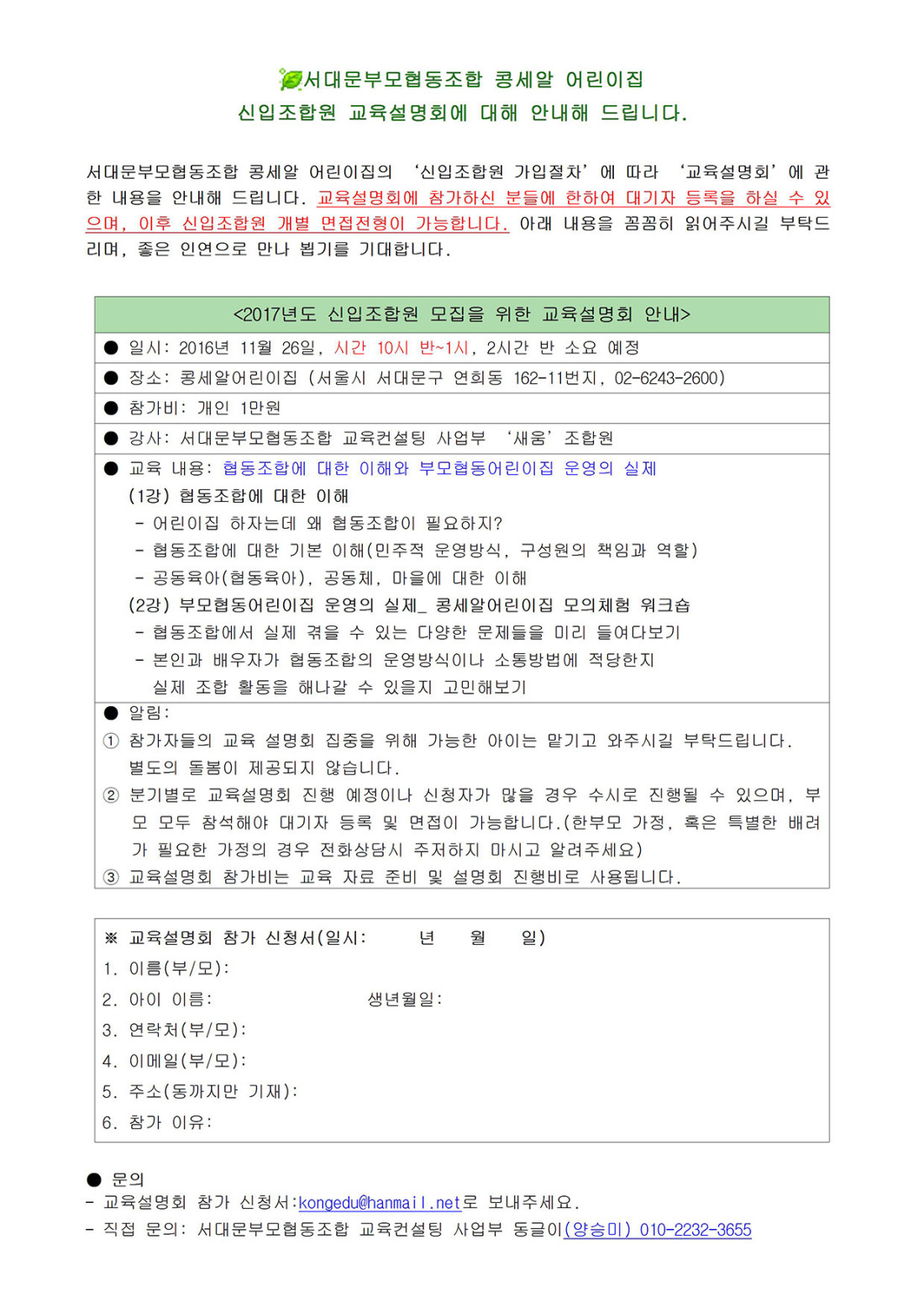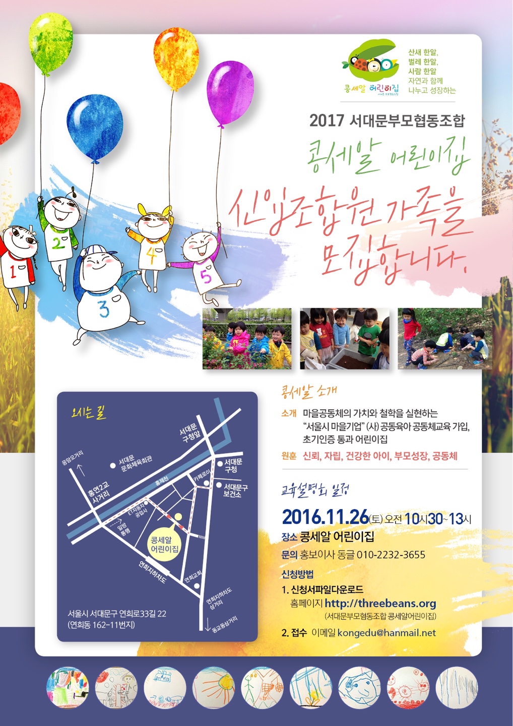 모집중 | 서대문구 콩세알 어린이집 신입 모집 교육설명회 안내 2016년 11월 26일(토) 10시반
