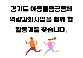 경기도 아동돌봄공동체 역량강화사업’은 <2022년 경기도 아동돌봄공동체 조성 공모사업>을 통해 선정된 약 70곳의 아동돌봄공동체를 지원하는 사업입니다. 마을에서 공간을 마련해 주민주도로 아동을 돌보는 돌봄공동체를 형성하여 활동하는 이들에게 기여하는 일입니다. 공동육아의 가치를 찾아가며 다양한 만남과 배움을 통해 즐거움과 보람을 찾고자 하는 분의 지원을 기다립니다.