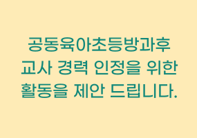 공동육아초등방과후의 안정적 운영과 의미 있는 돌봄과 활동, 아이들의 성장을 위해 애쓰는 공동육아초등방과후 선생님들이 조금 더 나은 여건에서 오래 일하실 수 있는 사회적 환경이 조성되기를 열망하며각 공동육아방과후에서도 해당 지자체(시군구)에 동일한 내용의 제안서를 제출하는 활동을 함께 해 나가기를 제안드립니다.