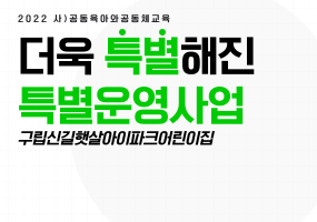 공동육아 조합이 매일매일 성장하는 힘은 크게 쭉쭉 뻗어나가는 부분도 있고 있는 그대로의 모습을 사랑하는 부분도 있을 것 같습니다. 이를 확인하고 가끔은 점검하기도 해야 할 때에 특별운영지원사업을 떠올리면 좋을 것 같습니다. 2022년 첫 번째로 특별운영사업을 마무리한 곳을 안내합니다. 구립신길햇살아이파크어린이집 입니다.