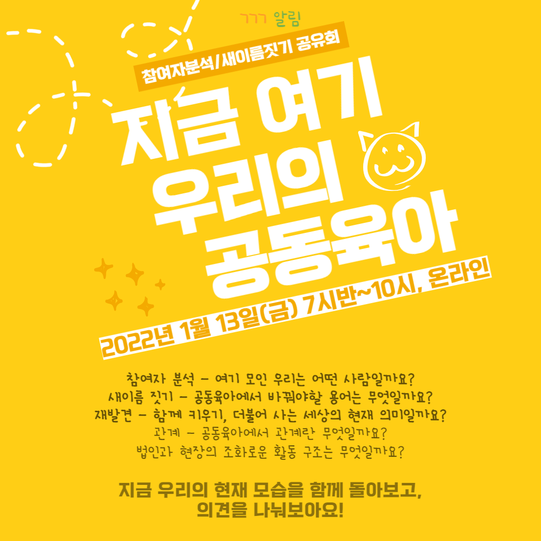ㄱㄱㄱ레터 9호 페이지 정보 작성자 운영자 작성일22-12-30 10:17 조회202회 댓글0건 본문 매주 찾아가는 공공교 뉴스레터, ㄱㄱㄱ레터!????클릭하면 전문을 볼 수 있어요! 그 추억들도, 그때 그 마음들도 나를 무너지지 않게버텨주는 기둥들의 한 곳으로 자라났다난 문을 두드렸고 그럼 문이 열렸다.“어서와.”라는 말로 시작되는 따뜻함도 기억이 난다.그 기억들은 나에게 가끔 울컥하고 마음이 차오를 정도로 다정하고 고맙다.아직 오픈채팅방에 안들어오셨나요?공동육아에 대한 정보를 나누는 정보공유방에 함께해주세요! 뉴스레터 피드백을 남겨주세요(클릭)지난호 다시보기(클릭)e-공동육아 뉴스레터 구독하기(클릭)공동육아와공동체교육 활동 후원하기(사)공동육아와공동체교육gongdong@gongdong.or.kr서울특별시 종로구 성균관로10길 5 2층 (사) 공동육아와공동체교육 02-323-0520수신거부 Unsubscribe 댓글목록 등록된 댓글이 없습니다. 목록
