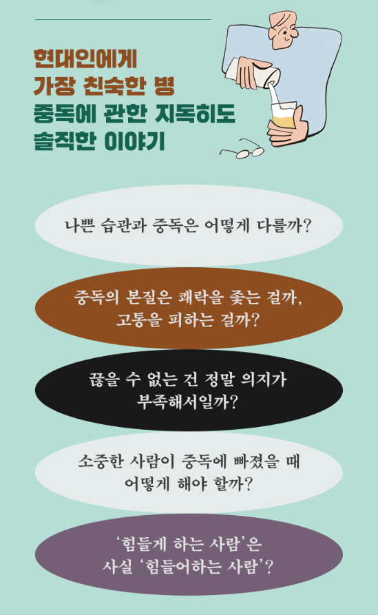 술을 끊지 못하는 문학 연구자와 담배를 끊지 못하는 정신과 의사가 의존증(중독)을 주제로 주고받은 편지를 묶은 책이다. 일본 의존증 치료계에서 가장 권위 있는 정신과 의사 마쓰모토 도시히코와 절도, 성(性), 과식, 알코올 등 다양한 중독 편력과 발달장애를 안고서도 자신을 놓지 않은 문학 연구자 요코미치 마코토가 의사-환자의 이분법적 관계를 넘어 부끄러울 수 있는 본인들의 과거사, 트라우마까지 솔직하게 드러내며 의존증과 그 주변의 ‘진짜 이야기’를 전한다.