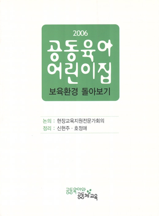 공동육아어린이집 보육환경 돌아보기-현장사진을 중심으로 -들어가며 -어린이집의 정체성 -마당 -시설물(놀이집, 의자) -텃밭과 꽃밭 -정원과 연못 -마당의 관리 -비상대피시설 -현관 -마루 -방 -개인사물함 -교사실 -자료실 -주방 -화장실 -계단 -안전관리 장치 -영역구성 -휴식공간 -언어영역 -역할 및 쌓기영역 -그 외의 영역 -공간의 활용 -게시판 -작품전시 -맺으며