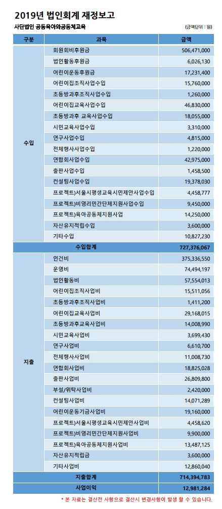 2019년 법인회계 재정보고(어린이운동기금 포함)