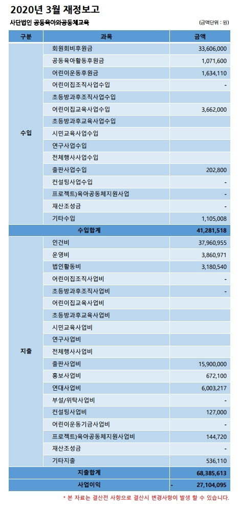 2019년 법인회계 재정보고(어린이운동기금 포함)