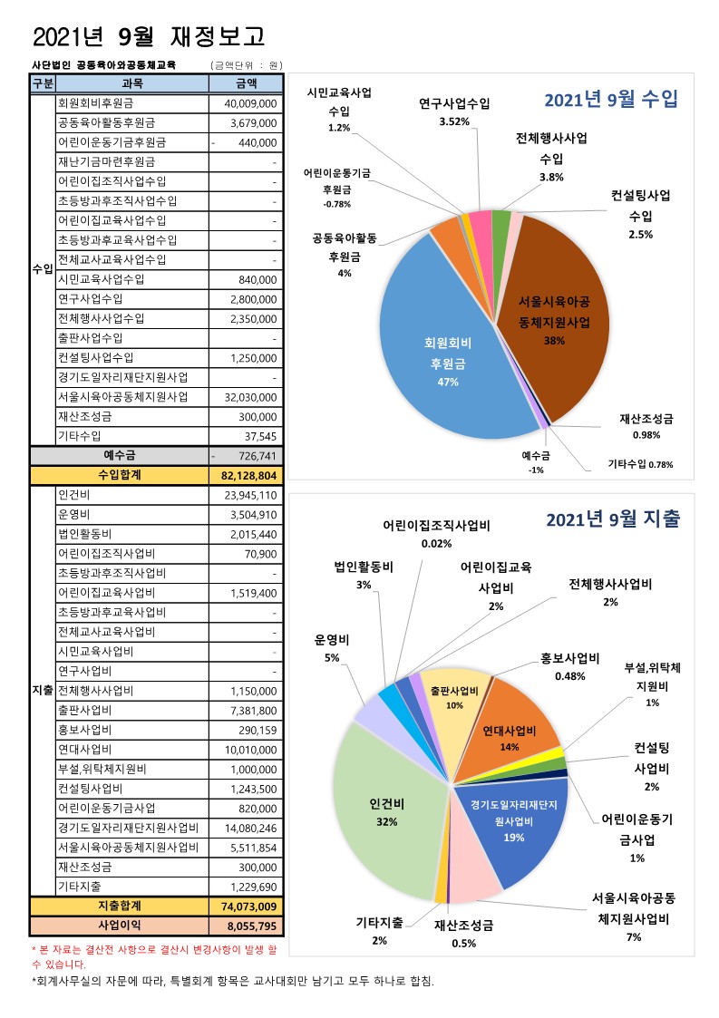 2021년 공동육아와공동체교육 연간 기부금 모금액 및 활용실적 명세서