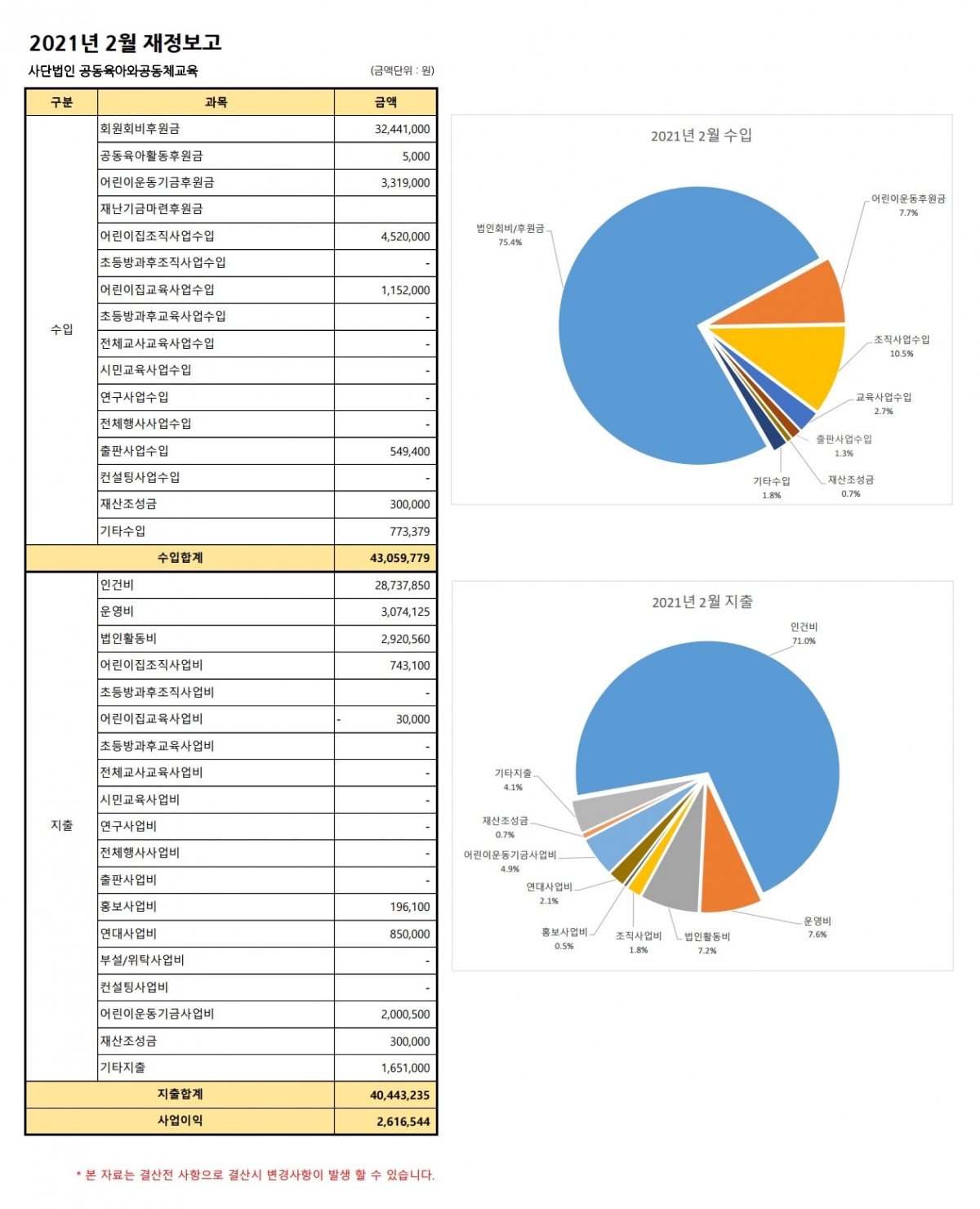 2020년 (사)공동육아와공동체교육 연간 기부금 모금액 및 활용실적 명세서