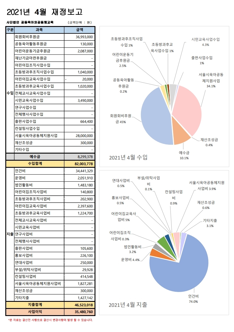 2020년 (사)공동육아와공동체교육 연간 기부금 모금액 및 활용실적 명세서