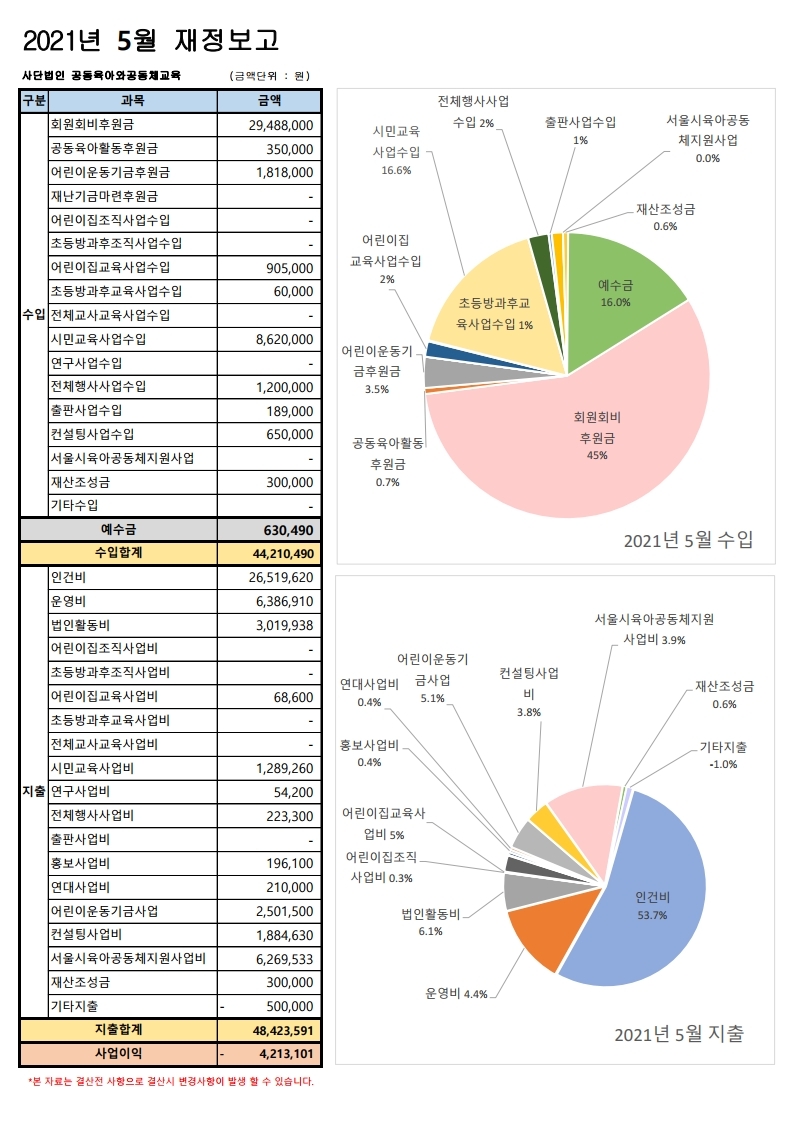 2020년 (사)공동육아와공동체교육 연간 기부금 모금액 및 활용실적 명세서