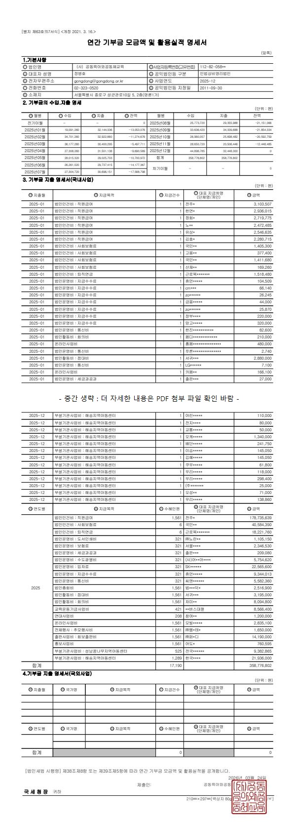 (사)공동육아와공동체교육 2025년 연간 기부금 모금액 및 활용실적명세서